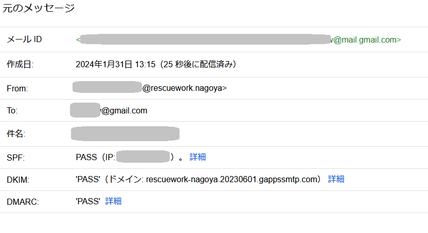 ↑のように表示されます。SPF, DKIM, DMARCが全部 PASS になっていれば、設定OKです。